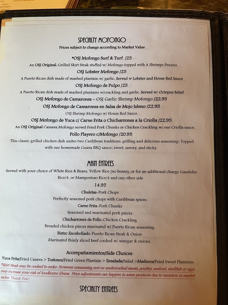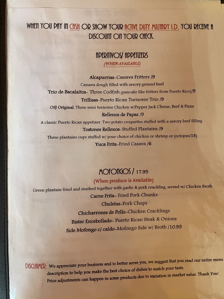 OSJ International is a Latin American - Spanish restaurant located in Lakewood, WA. This classy establishment offers a range of authentic dishes, including Alcapurrias Cassava Fritters, Trio de Bacalaitos, Gallega Spain traditional paella, and El Jibarito Sandwich. The menu caters to meat lovers with options like Ropa Vieja, a shredded braised beef dish cooked in a flavorful tomato sauce. Customers rave about the welcoming service and delicious food, with one reviewer noting the authentic taste of home in every bite. The restaurant is wheelchair accessible, offers outdoor seating, and accepts various forms of payment, including cryptocurrency. If you're looking for a taste of Puerto Rican cuisine in Washington State, OSJ International is a must-visit spot.